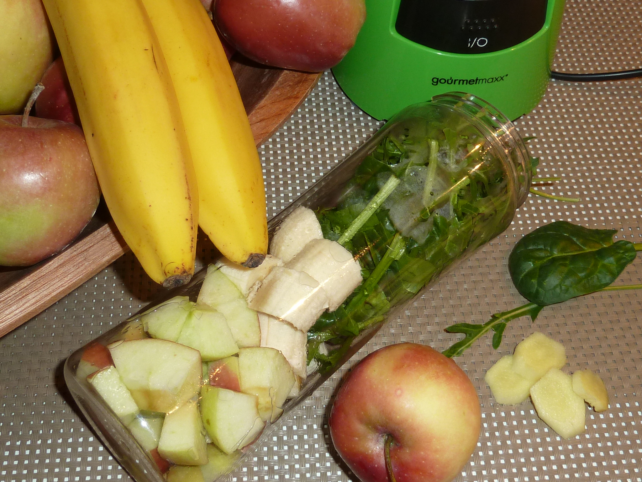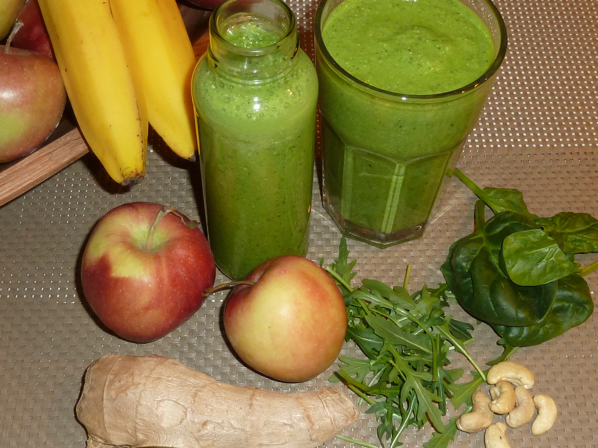 Zutaten: 3 mittelgroße Äpfel, 2 Bananen, 1 Handvoll Spinatblätter, 1 Handvoll Ruccolasalat, 1 Handvoll Cashewnüsse (sind super für die Serotoninproduktion), Ingwer, Zitronensaft, Mineralwasser, ein paar Eiswürfel.