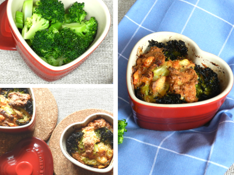 - Danach in eine Auflaufform oder kleine Förmchen geben und mit dem Brokkkoli belegen (ruhig etwas hineindrücken – sonst wird der Brokkoli dunkel bevor der Auflauf fertig ist).