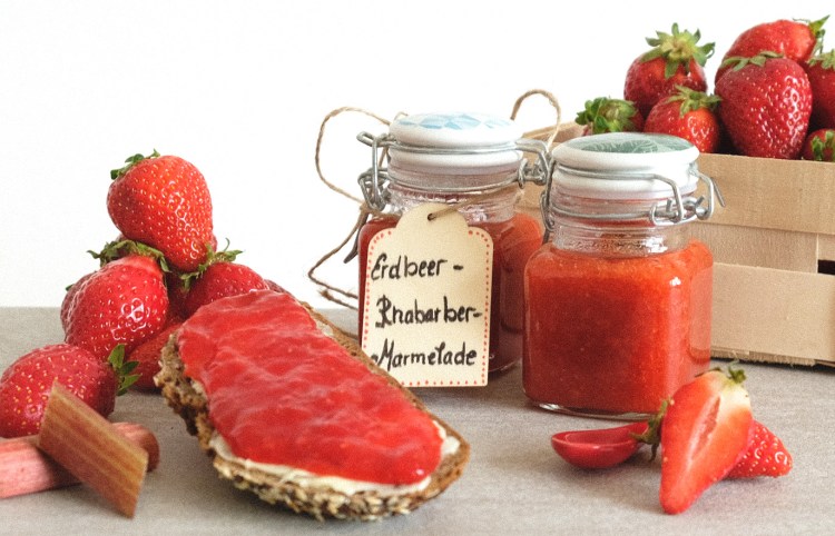 Vielleicht hast du ja auch mal Lust Marmelade mit deinen Kindern einzukochen? Am schönsten ist es natürlich die Erdbeeren selbst zu pflücken – dann schmeckt das Marmeladebrot zum Frühstück gleich noch besser. Auch Rhabarber ist schnell geerntet, geschält und zu Marmelade eingekocht. Gemeinsam ergeben Erdbeeren und Rhabarber eine frisch fruchtige Frühstücksidee. Die Konfitüre eignet sich auch bestens als nettes, essbares Geschenk zum Mitbringen, für den Brunch mit Freunden und zum Bestreichen von Keksen in der Weihnachtsbäckerei.