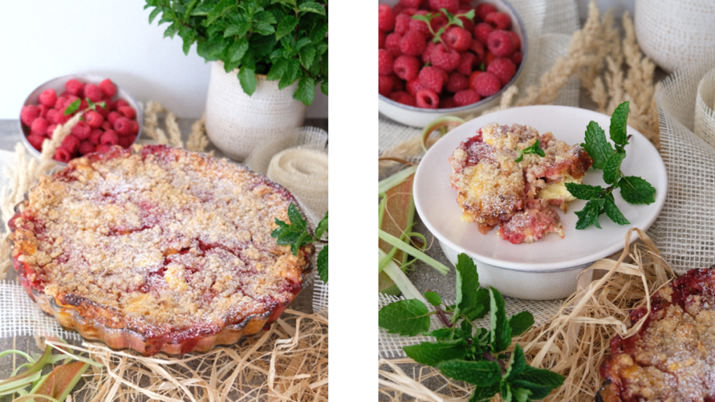 Einfaches Rezept für Topfen Rhabarber Himbeer Crumble