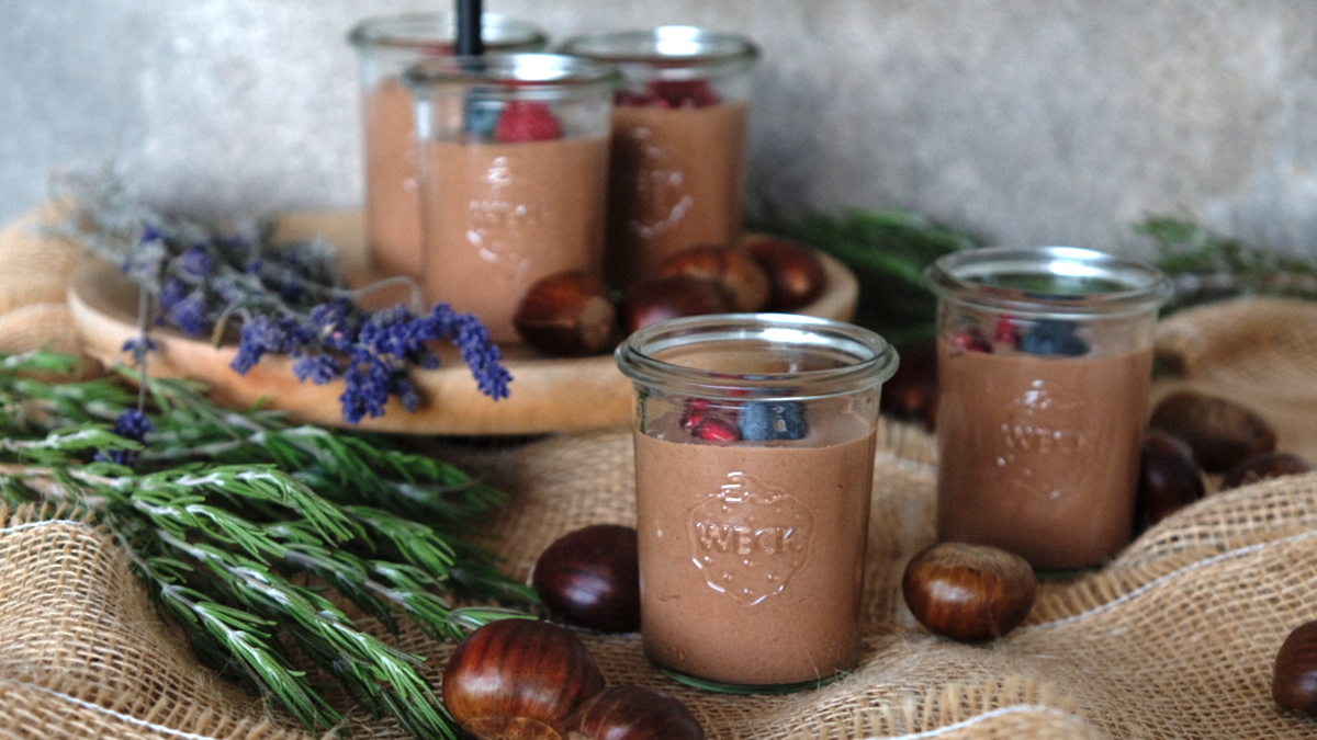 - Das fertige Maroni Schoko Mousse in kleine Gläser füllen und mit frischen Beeren und Granatapfelkernen garnieren.